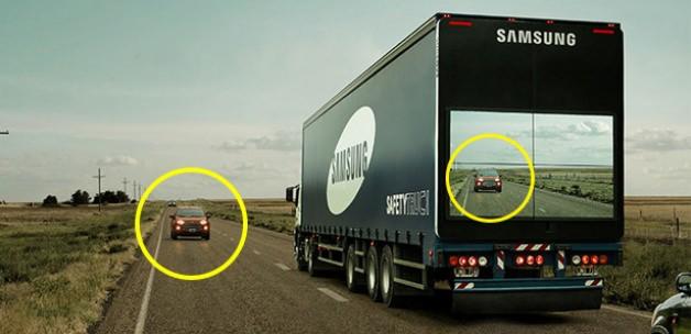 Samsung'un yeni projesinin hayata geçmesinin ardından arkadaki aracın sürücüsü, önündeki araca takılı dev ekrandan yolun tamamını görebilecek.